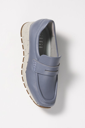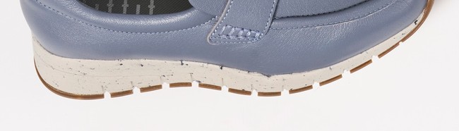 2.アッパーの素材には高級感のある柔らかい牛革(ホワイト、ブラック、ライトベージュ)、山羊革(ブルーグレー)を採用。ベロの下にゴムを施すことで様々な甲の高さの足に対応します。また、履き口は厚めのスポンジで足を包み込むようなフィット感が得られ、甲を深く覆うデザインで足をしっかりホールドしてくれるなど、スニーカーのような履き心地を追求しています。