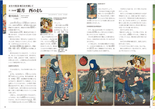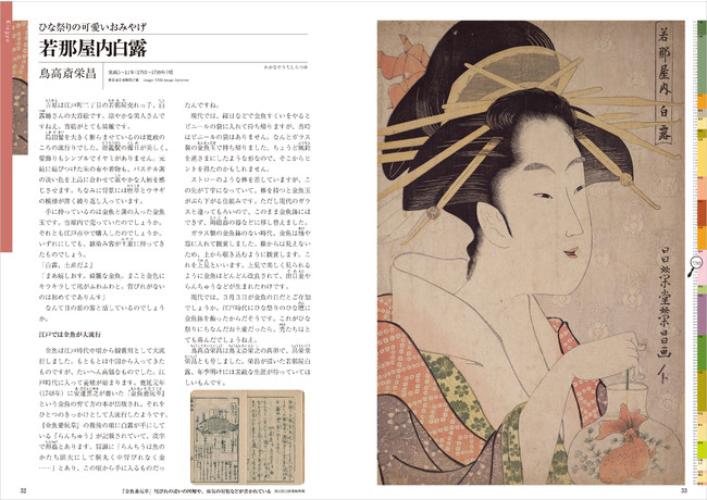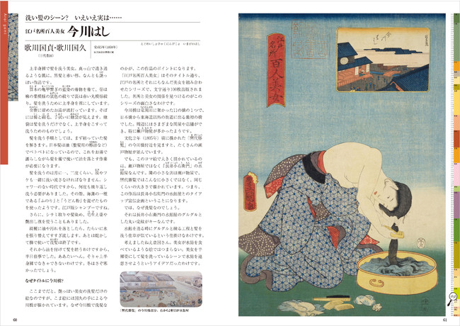 様々な浮世絵に描かれた女性の姿から、江戸の生活を易しく読み解きます。初午や納涼船やお月見などの季節の行事、洗髪やお化粧や睦みごとなどの個人的な物事、寿司や天ぷらやウナギなどの江戸の食事、花魁や八朔やブロマイドなど流行の発信地・吉原のあれこれ、祭りや旅といったエンタテインメント。これらさまざなな情景に描かれた女性たちの姿から、「この浮世絵はどんなシーンで誰を描いたものか」「そこから読み取れる当時の生活とは」を丁寧に易しく解説していく本です。