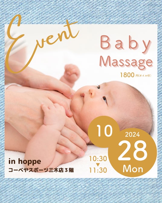特定非営利活動法人ほっぺ(代表:大森 奈津子)は親子向けイベントとして、2024年10月28日(月)にhoppe(コーベヤスポーツ三木店3階)にて、ベビーマッサージ体験ができる「Baby Massage in hoppe」を開催いたします。