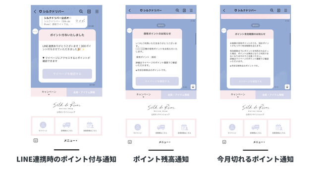 シルクドリバーでは、ポイントの使い忘れやそれによる顧客満足度の低下を防ぐためにもLINEを活用し、LINE連携会員には「連携時のポイント付与のお知らせ」「ポイントの残高通知」「今月で期限が切れるポイントのお知らせ」などをLINEで自動配信しています。これにより、LINEを活用した顧客体験の向上を実現し、これまで散見された月初や月末の売上の落ち込みが軽減されるなどの成果もあらわれています。