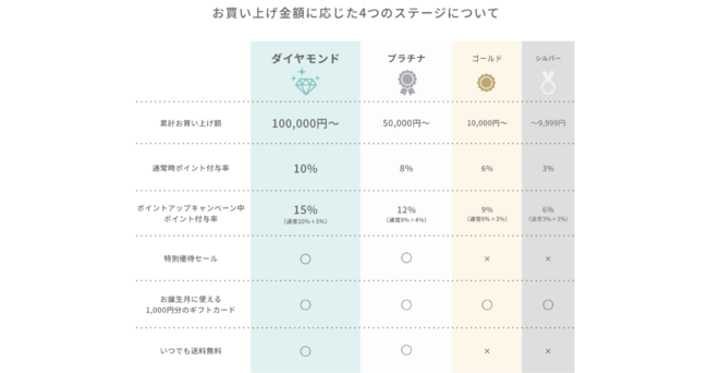 シルクドリバーでは、累計購入金額に応じたポイントプログラムを用意し、会員ステージに合わせて「ポイント付与率アップ」や「いつでも送料無料」などのサービスを提供しています。