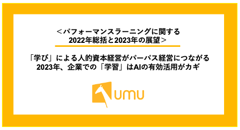 オンライン学習プラットフォーム「UMU(ユーム)」を展開しているユームテクノロジージャパン株式会社(本社:東京都港区、代表取締役:松田しゅう平、https://www.umujapan.co.jp、以下、ユームテクノロジージャパン)は、「パフォーマンスラーニングに関する2022年総括と2023年の展望」について発表いたしましたので、お知らせいたします。