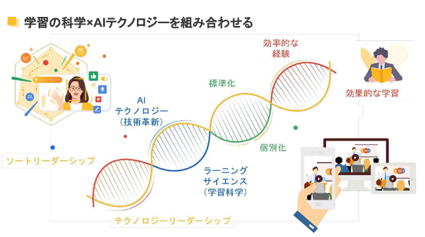 次に、「テクノロジーリーダーシップ」とは、最高の構造で学べる学び方が標準化されることによって、個別化とスケーラビリティを実現することを言います。AIの強みを活かし、無駄のない学びを大規模組織に展開させることができます。最先端の研究によって検証された効果の高い学びを、個別化とスケーラビリティで組織として生産的に提供していくということは、当社が最も得意としていることの一つです。