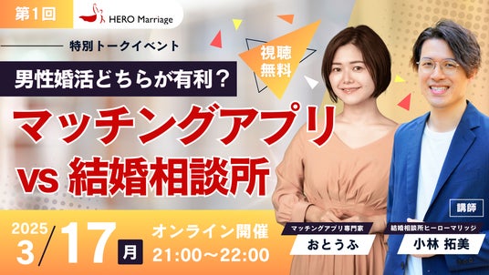 株式会社アルファブル(本社:東京都中野区、代表取締役:香美惇)が運営する男性のための結婚相談所「ヒーローマリッジ」は、3月17日(月)に特別トークイベントをXスペースで開催いたします。ゲストとして、マッチングアプリ専門家おとうふさんをお招きし、「マッチングアプリと結婚相談所の男性婚活」をテーマにお話しいたします。