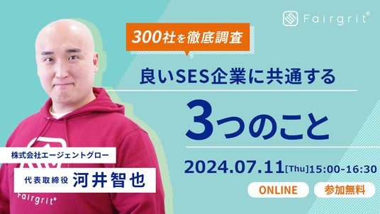 株式会社エージェントグロー(本社:東京都港区、代表取締役:河井智也/以下、「当社」)が毎月開催しているSES企業様を対象にした無料オンラインウェビナーにつきまして、2024年7月度の開催内容と日程が決定いたしました。