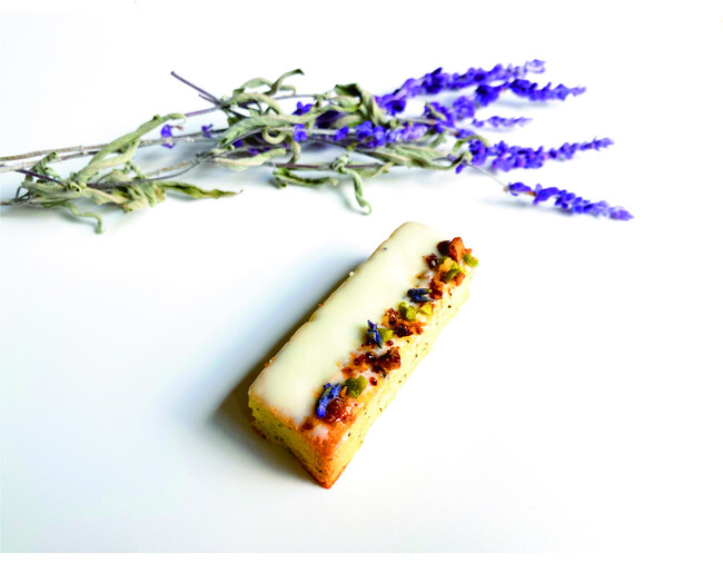優しい味わいの生地にたっぷりのオレンジ、食感を楽しめるポピーシード、香ばしいナッツとラベンダーで飾りました。