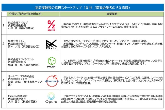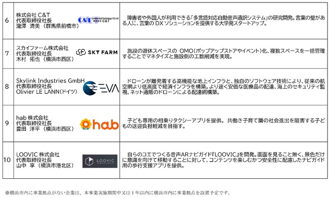 スタートアップから企画提案を募集し、このたび、企画10 件を採択しました。今後、採択されたスタートアップに対して、実証実験やトライアル導入等のコーディネートを実施し、事業化を支援します。また、支援にあたって、スタートアップと共創・協業を図る協力企業や団体を募集しています。是非、横浜発のイノベーション創出にご参画ください。