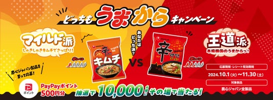 株式会社農心ジャパン(本社:東京都千代田区、代表取締役社長:金大廈)は、2024年10月1日(火)~11月30日(土)の期間、「どっちもうまからキャンペーン」を開催します。「本場韓国のうまからっ!王道派」におすすめの「辛ラーメン」や「しゃきしゃきキムチでさっぱり!マイルド派」におすすめの「辛ラーメン キムチ」など農心ジャパンの全製品を対象に、ご購入いただいたレシートを撮影してLINE上で応募いただくことで、その場で即時抽選を実施。10,000名様にPayPayポイント500円分が当たります。