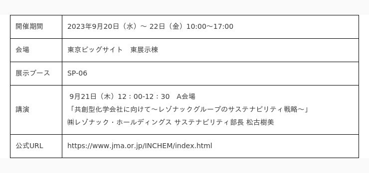 株式会社レゾナック(社長:高橋秀仁、以下、当社)は、2023年9月20日(水)~22日(金)に、東京ビッグサイトで開催される「INCHEM TOKYO 2023」に出展します。