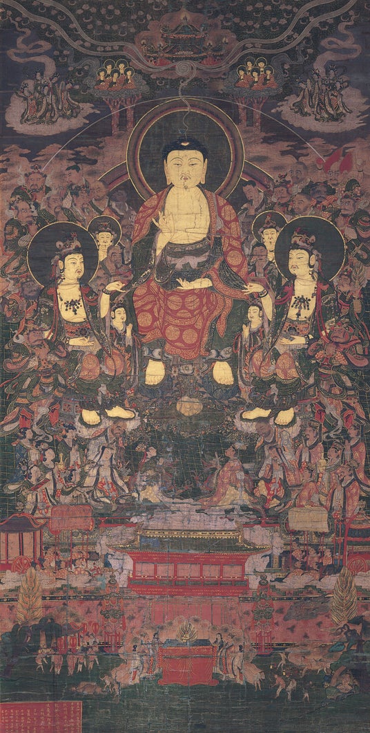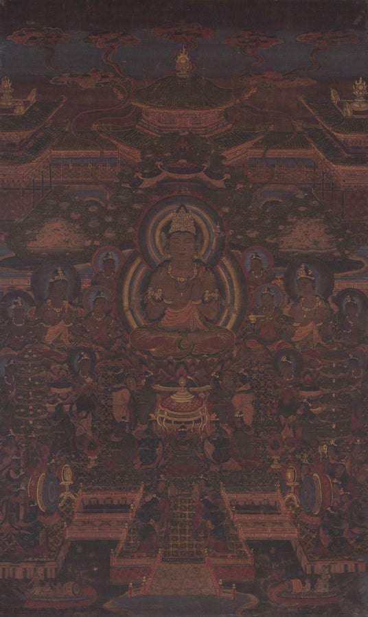 弥勒下生変相図 1幅 絹本着色 朝鮮半島 高麗・至正10年/忠定王2年(1350) 177.7×90.3 cm 和歌山・五坊寂静院 (展示期間:5月21日~6月16日)