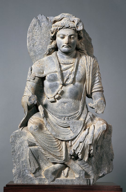 弥勒菩薩交脚像 1軀 片岩 ガンダーラ 2~3世紀 高62.0 cm 平山郁夫シルクロード美術館