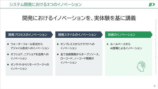現役エンジニアがIT業界でのさまざまなイノベーションについて講義を行いました。本講義では、「開発プロセスのイノベーション」、「開発スタイルのイノベーション」、「技術のイノベーション」の3つのテーマに焦点を当て、講師自身の実務経験を交えながら、業界の最新動向や技術革新の背景について具体的かつ実践的に解説しました。質疑応答の時間では参加学生から多くの質問が寄せられ、IT業界への関心の高さが感じられる有意義な講義となりました。