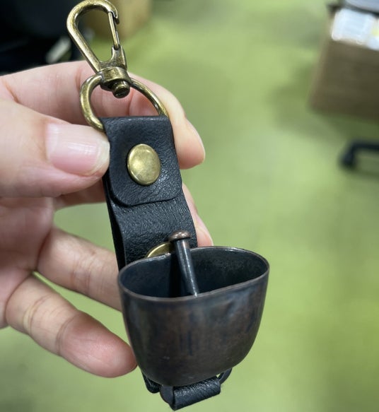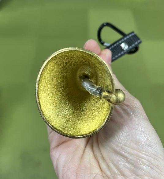熊よけ鈴(真鍮):鈴の鳴り子を本体のくぼみに引っかけて固定し消音する