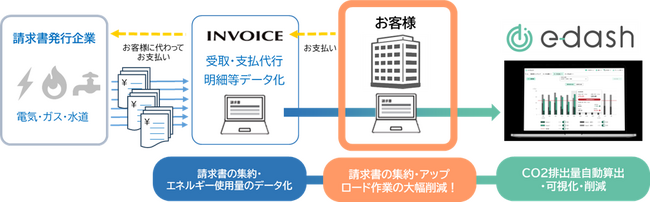 ◆これにより、従来「e-dash」利用時に必要だった請求書の収集・アップロード作業が不要となり、CO2排出量の算出・可視化業務を効率化。