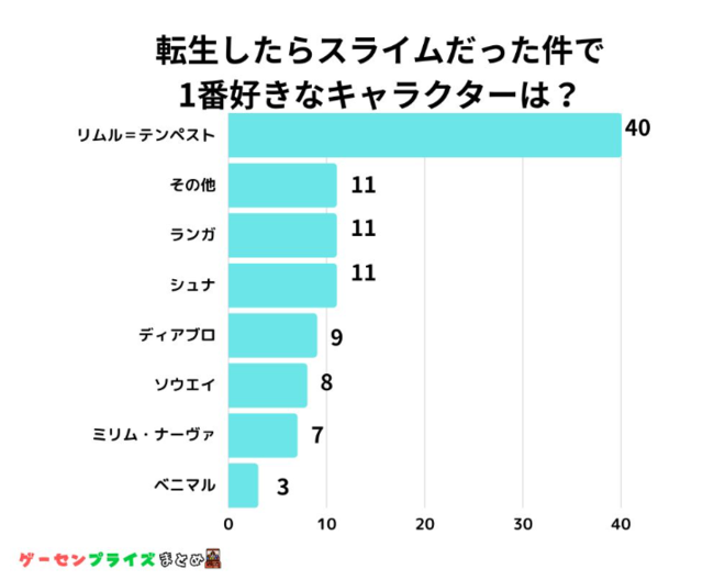 「転生したらスライムだった件」についてアンケート調査した結果、1位は『リムル=テンペスト』でした。