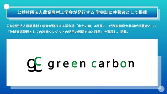 Green Carbon株式会社(代表取締役:大北潤、以下Green Carbon(読み;グリーンカーボン))はこの度、公益社団法人農業農村工学会が発行する学会誌「水土の知」4月号に、代表取締役大北潤が共著者として『地域資源管理としての炭素クレジットの活用の展開方向と課題』を寄稿し、掲載されたことをお知らせします。
