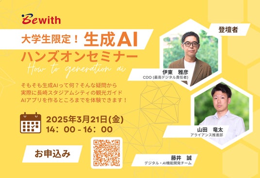 ビーウィズ株式会社(本社:東京都新宿区、代表取締役:森本 宏一)は、大学生を対象にした「生成AIハンズオンセミナー」を2025年3月21日(金)に長崎スタジアムシティ内デジタルラボ長崎にて開催します。
