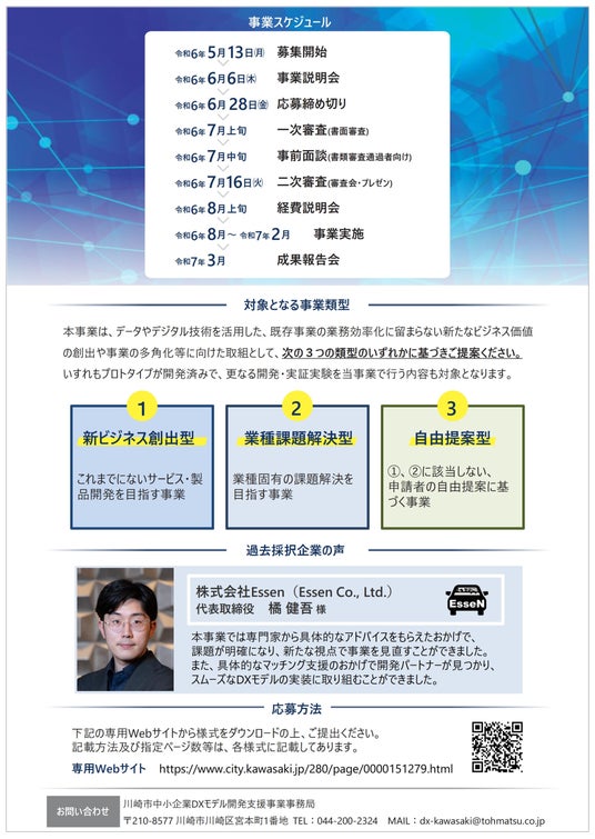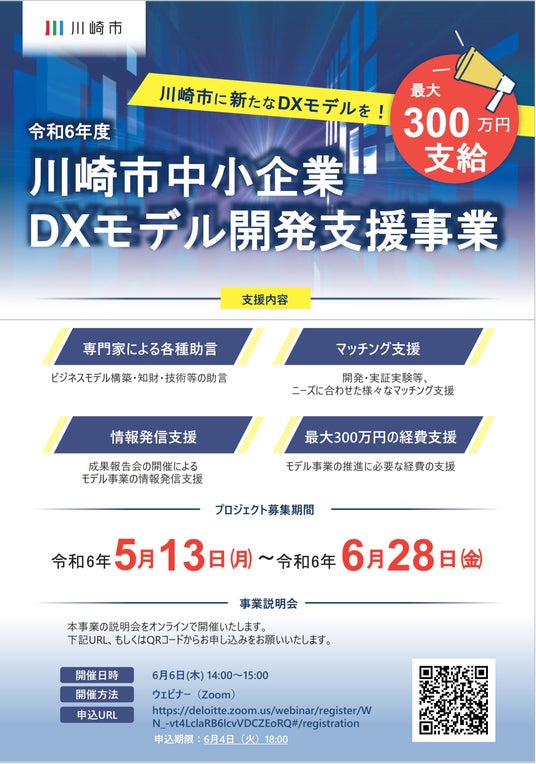 川崎市内に事業所を有している中小企業者等を対象に、データやデジタル技術を活用した、既存事業の業務効率化に留まらない新たなビジネス価値の創出や事業の多角化等に向けた実現を図るため、デジタル技術を活用したDX(デジタルトランスフォーメーション)に資するモデル事業を募集し、開発・実証に係る費用等の支援を通じて、先進事例の創出とその成果を情報発信すること等により、市内中小企業の産業競争力の強化とDX化を推進します。