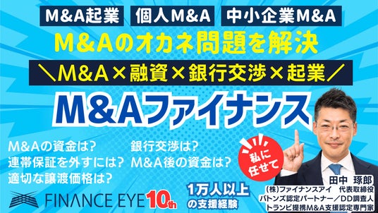 株式会社ファイナンスアイ(所在地:大阪市、代表:田中琢郎)は、M&Aの買手向けに買収資金を増やしたいM&A起業やM&A買収を考える起業家・個人事業主・中小企業の経営者に向けて特別なセミナーを開催致します。『M&A×融資で買手の買収資金を自己資金×●●倍にする!M&A×起業×融資×銀行交渉の今スグ使える実戦ノウハウ。社長の連帯保証無し!無担保で最大7200万円!日本政策金融公庫の新規開業資金(創業融資)を活用する。』(※参加者の顔出しナシ)と題したこのセミナーでは、日本国内M&A成約数1位のBATONZ(バトンズ)認定パートナーの田中琢郎社長自らが、1万人以上の起業家や経営者を支援した実戦経験をもとに、M&A起業やM&A買収資金にも使える、新規開業資金(創業融資)を成功させるポイント、M&Aを成功させるための案件選定基準を分かりやすくお伝えします。本セミナーは、2024年6月19日(水)19:00より、オンラインでZOOMを使用して実施されます。コロナ禍を乗り越え、億超えの起業家を生み出し続けたファイナンスアイが、良い案件も悪い案件も1万人以上をリアルに支援したから分かる融資審査の本音と建前、M&Aのオカネとリスクの解決策を分かりやすく伝えます。セミナーでは田中社長とライブで質疑応答ができるので厳格化する融資審査を乗り越えるために具体的なアドバイスが欲しい人はチャンスです。セミナー申込時の受付フォームで事前質問に記入してもらえれば、セミナー中に回答できそうにない内容でも別途具体的なアドバイスを受けられます。この機会に誰にも相談できなかった悩みや疑問を解決しましょう。このセミナーを受講すれば、あなたのビジネスもファイナンスの力を活用して成功の軌道に乗ることができるでしょう。会社の未来のオカネをクリエイティブする事がファイナンスです。