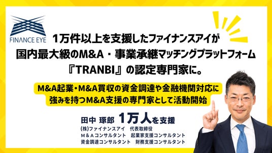 M&A起業や買収資金の資金調達や金融機関対応に強いファイナンスアイ、国内最大級のM&A・事業承継マッチグプラットフォーム『TRANBI(トランビ)』にてM&A認定専門家として活動開始