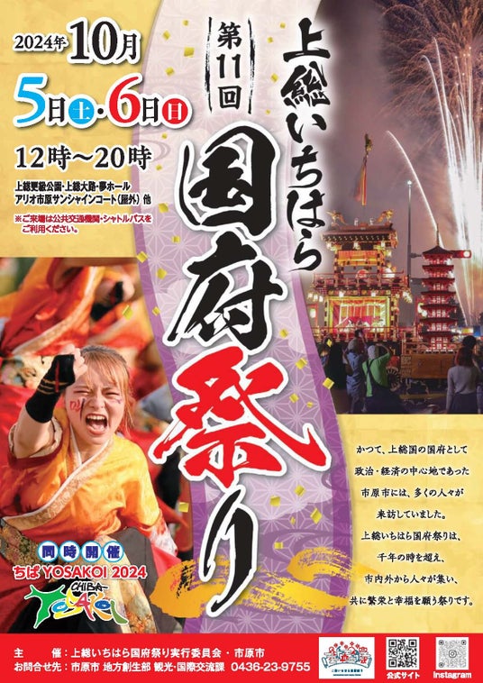 「上総いちはら国府祭り」は、市原市の魅力を市内外に発信し、多くの方々に訪れていただくことで、賑わいを創出するとともに、市原市に対する誇りや郷土愛を育むことを目的とした本市最大の祭りです。