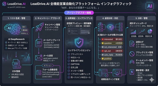 本サービスは、見込み客リストのAI自動生成、パーソナライズされたメール営業の一括送信、AIによる返信分析・エスカレーションまでを一つのプラットフォームで完結させる、新しい営業自動化ソリューションです。