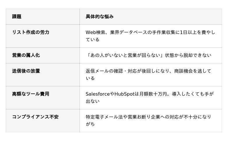 特に、創業期から成長期にある企業の経営者・営業担当者は、以下のような課題を同時に抱えています。