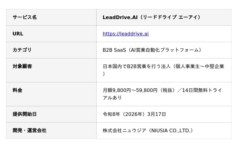 株式会社ニュウジア(本社:東京都中央区、代表取締役:柏口之宏)は、中小企業向けAI営業アシスタントSaaS「LeadDrive.AI」( https://leaddrive.ai )を本日正式リリースいたしました。
