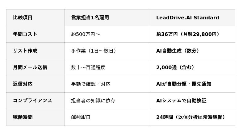 営業担当者1名を正社員として雇用する場合、給与・社会保険・交通費・PC等の経費を含めると年間約500万円以上のコストが発生します。LeadDrive.AIのStandardプラン(月額29,800円)であれば、年間約36万円でリスト作成・メール送信・返信分析を自動化できます。