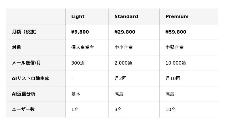 特に個人事業主やスタートアップにとっては、Lightプラン(月額9,800円・初期費用なし)から利用を開始できるため、資金が限られた創業期でも営業活動の仕組み化に着手できます。