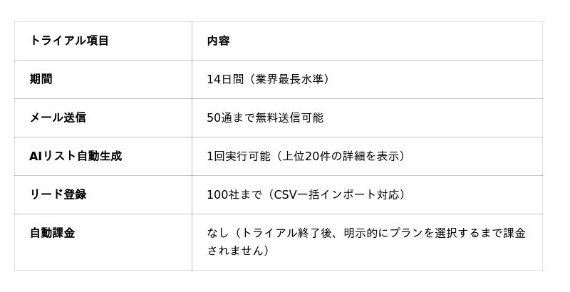 国内の主要な営業自動化ツールの中には無料トライアル自体を設けていないものや、トライアル期間が3日間のみのサービスもあります。LeadDrive.AIは、十分な検証期間と送信枠を確保することで、導入前の不安を解消いたします。