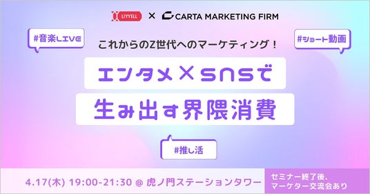 株式会社CARTA HOLDINGS(以下、CARTA HD)のグループ会社で、マーケティング特化の事業を展開する株式会社CARTA MARKETING FIRM(東京都港区虎ノ門、代表取締役:西園 正志、以下CARTA MARKETING FIRM)は、2025年4月17日、集客エンタメ産業を応援する「LIYYELL(ライエル)」を運営する株式会社マインドスクエア(東京都渋谷区、代表取締役:寺西 良将、以下マインドスクエア)と共同で、セミナー「これからのZ世代へのマーケティング!エンタメ×SNSで生み出す界隈消費」を開催いたします。
