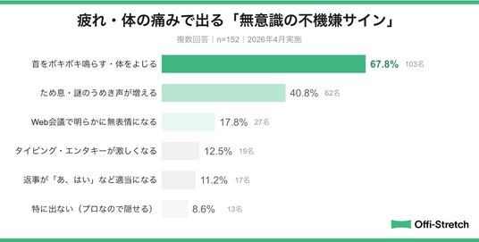 疲労・身体の痛みを感じたとき、無意識に首をボキボキ鳴らす(67.8%)、ため息・うめき声が増える(40.8%)、Web会議で明らかに無表情になる(17.8%)など、91.4%のビジネスパーソンが何らかの「隠れ疲労ハラスメント」サインを出していることが判明しました。