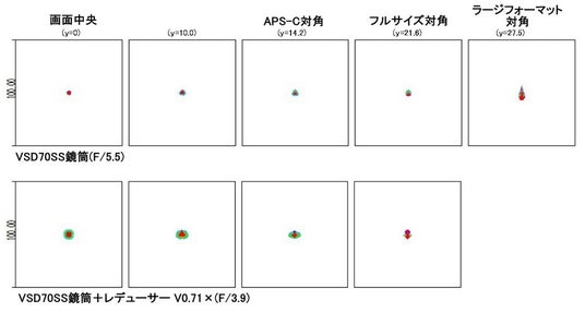 ユーザーのスキルに関わらず、満足できる撮影結果が安定して得られるよう、VSD70SSでは設定精度に対する「ピークのなだらかさ」にこだわりました。エアリーディスクに収まるピント範囲が広い設計を採用していますので、ピント合わせ精度やスケアリングのズレが多少残っていても写野周辺における星像の色味変化や崩れが起こりにくくなっています。これにより、写野全面に渡りシャープで美しく均一な星像が常に得られ、撮影後の画像処理も含めて安定した撮影結果が期待できます。