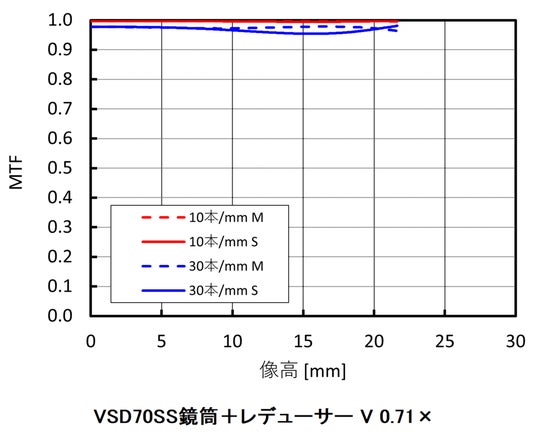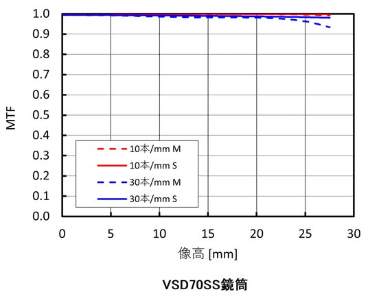 MTFとは「Modulation Transfer Function」の略で、レンズ性能の評価指標を空間周波数特性で表したものです。レンズの解像力や撮影対象の持つコントラストを像面でどれだけ再現できるかを表します。グラフは水平軸に画像中央からの距離、垂直軸にコントラスト値(最大1)を設定しています。10本/mmの曲線(赤)が1に近いほどコントラストが高く、30本/mmの曲線(青)が1に近いほど)解像力が高いことを示します。VSD70SSではコントラスト値がいずれもほぼ1に近い値を示しており、極めて優れた光学系であることが分かります。
