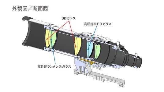 凸レンズにSDレンズ2枚、高屈折率EDレンズ1枚(5群5枚構成)を使用し、前側の凹レンズに新開発の高性能ランタン系ガラスを採用しています。これにより軸上色収差と非点収差を極限まで抑えることに成功。中心像、35mm判フルサイズはもちろんラージフォーマット44×33mm(※)の最周辺に至るまでシャープで美しく均一な星像が得られます。