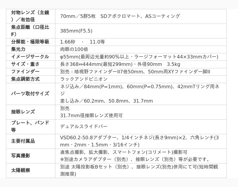 昨年発売した「VSD90SS鏡筒」の高性能をコンパクトボディに凝縮。撮影品質から画像処理までのユーザビリティに優れ、天体写真をさらに手軽に撮影することを目指しました。その上、眼視観測派も納得の高解像、高コントラスト、高平面性を実現し、低倍率から高倍率まで倍率を問わない優れた眼視性能をもたらしました。
