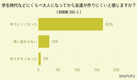 学生時代などにくらべ大人になってから友達が作りにくいと感じますか?の問いに対して最も多かったのが「作りにくくなった(83%)」でした。 次いで「特に変わらない(14.%)」「作りやすくなった(3%)」という結果でした。大多数の方が作りにくくなったと感じているようです。