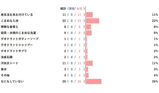 次に 「気になるニオイへの対策は?」とアンケート調査した結果、1位は『なにもしていない』でした。1位:なにもしていない2位:こまめな入浴3位:食生活に気をつけている3位(同率):汗拭きシート5位:寝具・衣類のこまめな洗濯──────────────────────────────