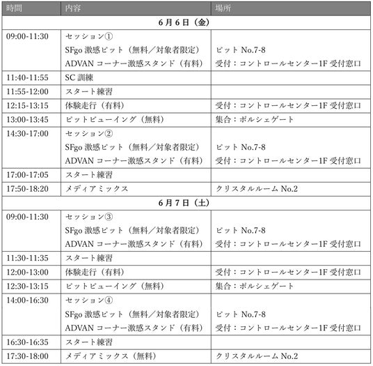 また、今回の公式テストでは2日間を通してドライバーが取材を受けるメディアミックスゾーンに観覧エリア(無料)を設け、ドライバーをより身近に感じられる施策や、通常レース時には有料となるピットレーンを解放するピットビューイング(無料)、ピットレーンを走行するマシンを手が届きそうな距離で体感できる“SFgo激感ピット(一部対象者限定)”、SUPER FORMULAでは初の実施となり争奪戦必須の“ADVANコーナー激感スタンド(有料)”に加えて、ご来場の皆様に無料でご利用いただけるクリスタルルーム(無料)の解放など、モータースポーツファンはもちろんのこと、一緒にご来場したご友人、ご家族も心ゆくまでお楽しみいただけます。