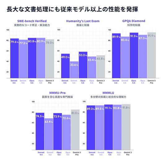 「Claude Sonnet 4.6」は、「Claude Sonnet 4.5」と比較して、主要なベンチマークで大幅な性能向上を実現しました。長文読解能力の向上により、コード理解力や契約書や研究論文などの長大な文書処理にも従来モデル以上の性能を発揮します。