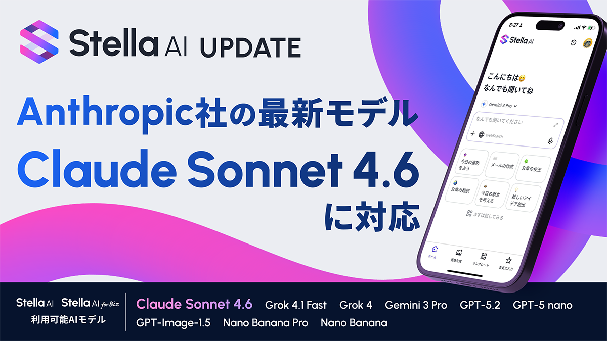生成AIサービス開発を手掛ける株式会社SUPERNOVA(本社:東京都港区 代表取締役社長 木本 東賢 以下、当社)は、当社の生成AIサービス「Stella AI」および「Stella AI for Biz」で利用可能なAIモデルに、Anthropic社の最新AIモデル「Claude Sonnet 4.6」を2026年2月20日(金)より追加します。