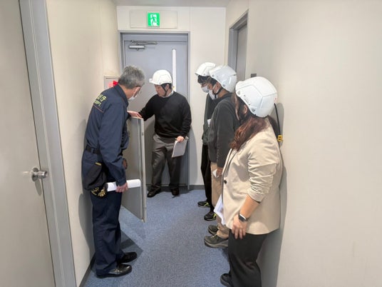 同時に管理本部では、震度6強の地震発生後に建物内で火災が発生したという想定のもと、避難訓練を実施しました。