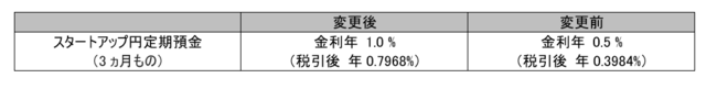 当行では、新規に口座開設するお客さま向けに、優遇した金利を設定した「スタートアップ円定期預金」をご提供しています。2022年5月1日預入分より、本商品の金利をこれまでの年0.5%から年1.0%(いずれも税引前)に引き上げます。本商品は、新規に口座開設したお客さまが、口座開設月を含む3ヵ月目の末日まで、店頭・電話・インターネットにてお預け入れいただくことができ、最低預入金額以上であれば期間中、何度でもいくらでもご利用いただけます。