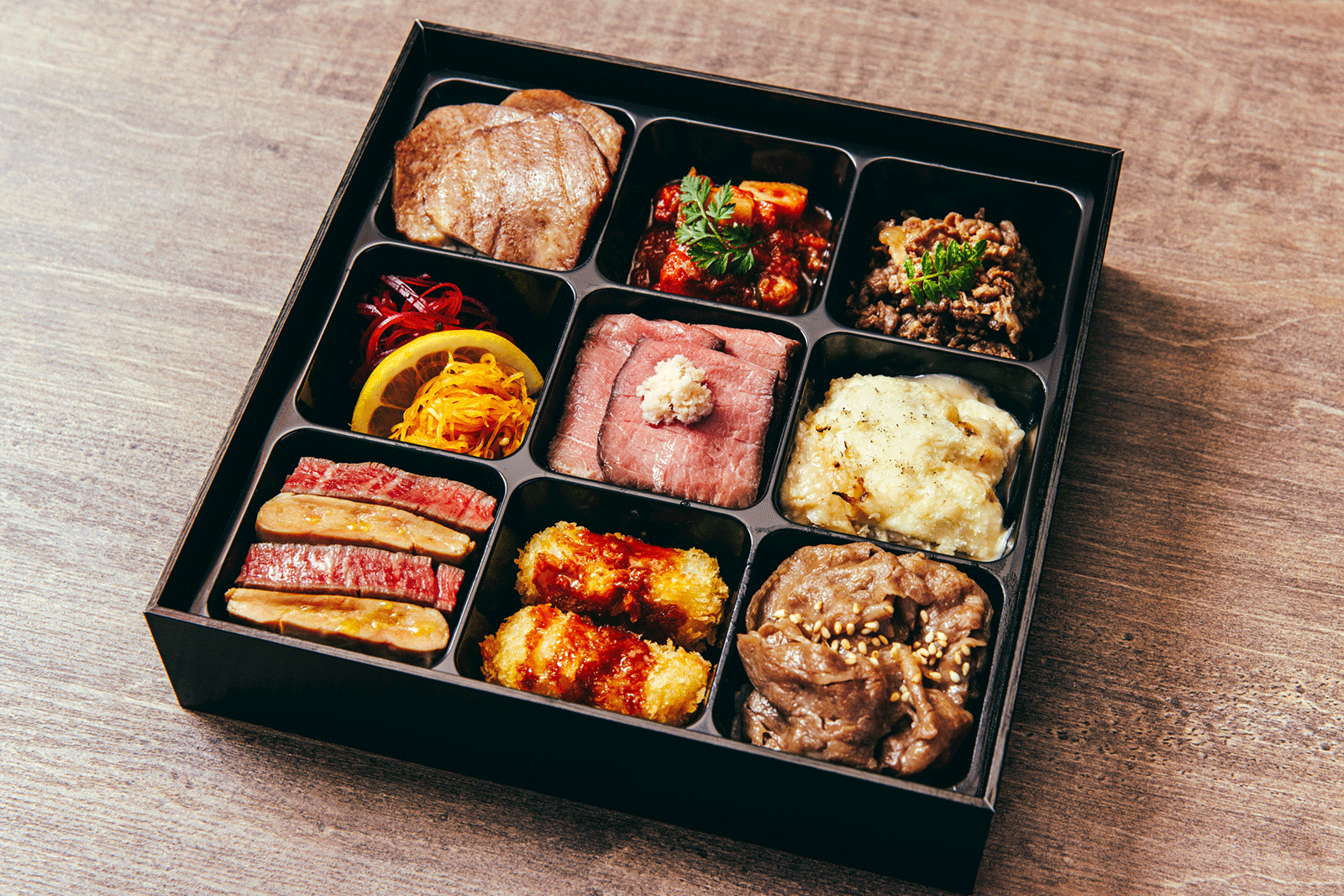カリッと香ばしく、中はレアでジューシーに焼き上げた“極上ヒレステーキ”をメインにローストビーフと焼肉、長谷川北斗シェフ監修の和牛100%ハンバーグをお楽しみいただけます。試作を重ねてたどり着いた、文字通り至高のお弁当です。