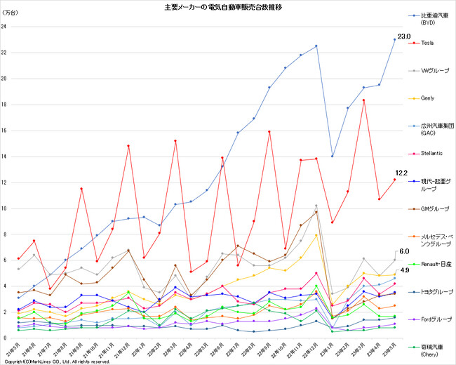 新モデル「海鴎(Seagull)」をはじめ各モデルの販売が好調なBYDが前月からさらに台数を伸ばし首位を独走。今までの最多販売であった、2022年12月の22.5万台を0.5万台上回り、2023年5月は23万台となった。広州汽車集団(GAC)もAion SやAion Yの販売台数が好調であるため、毎月順調に販売台数を伸ばしている。