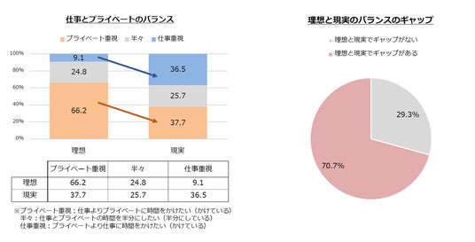 仕事とプライベートのバランスにおいて、理想と現実のギャップを感じている割合は約7割という結果に。全体では66.2%の人がプライベート重視の生活を送りたいと思っているものの、実際にその生活を送れている人は全体の37.7%となっています。一方で、仕事とプライベートのバランスが半々を理想としている人が24.8%いるなかで、現実でも半々と回答した方は25.7%と、理想と現実の差分はわずか0.9%となりました。