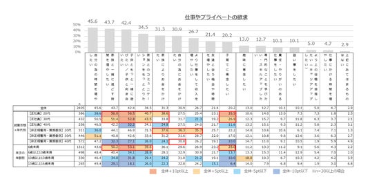年代別に仕事やプライベートに関する欲求を見ると、20代のワーママは他の年代より家族や子供と過ごす時間を増やしたい、家族にお金をかけたいなど、意識が家族に向いているようです。