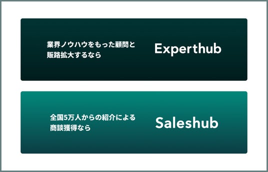 - 事業内容:顧客紹介サービス「セールスハブ」および成果報酬型顧問サービス「エキスパートハブ」の開発・運営