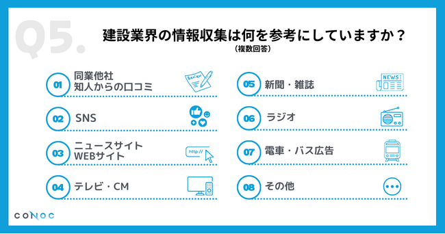 建設業界の情報収集において参考にしていること1位は「同業他社・知人からの口コミ」(27%)、次いで「SNS(Twitter / Instagram / TikTok / YouTube / Facebook)」(20%)、「ニュースサイト・WEBサイト」(19%)という結果となった。